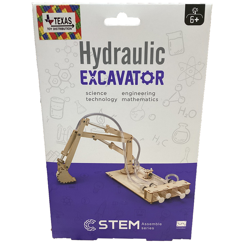 This wooden STEM construction kit builds a hydraulic excavator! This kit teaches how liquid pressure can be used to create mechanical functions and control the excavator arm.