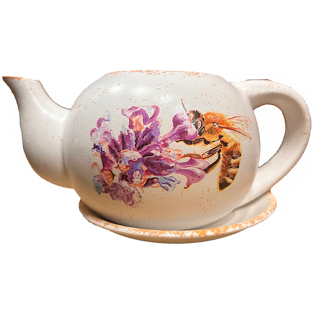 This adorable flowerpot is shaped like a teapot! The flower and honeybee design brings a nostalgic nature touch to your home. Comes with a hole in the bottom, and a saucer. Comes in retail box.