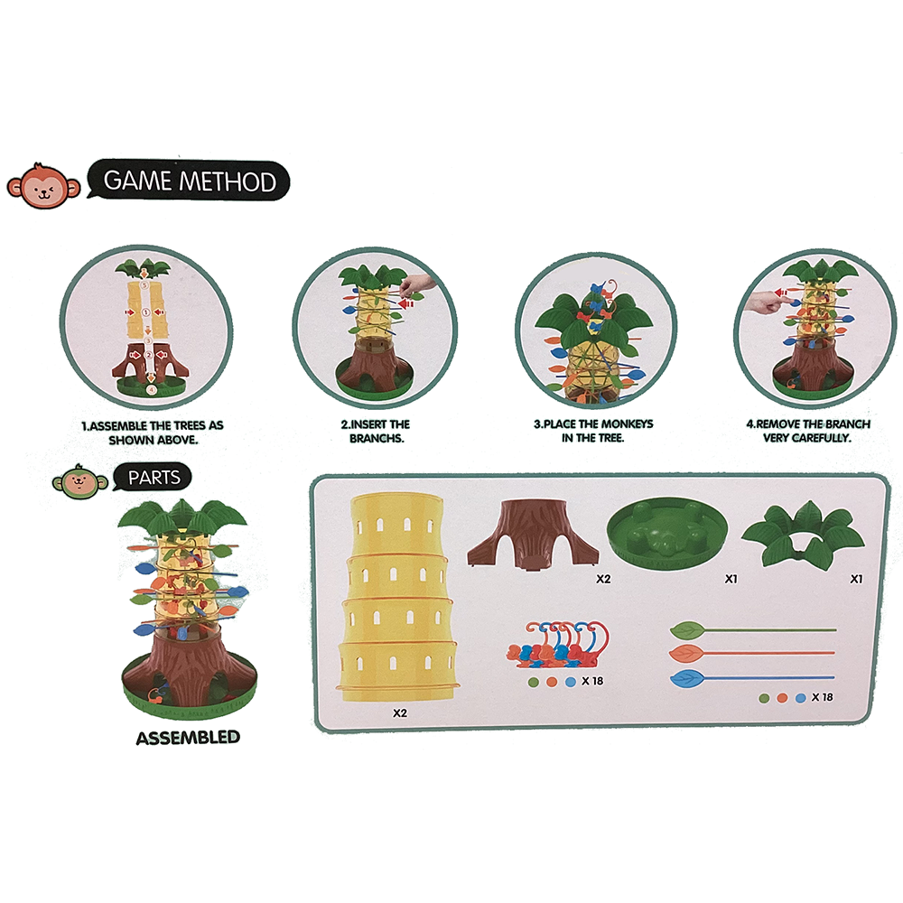 The main body is a replica of a tree. The plastic sticks are inserted into the trunk of the tree and the monkeys are then placed through the hole in the top of the tree. The monkeys' long tails then hang upside down from each plastic stick. Each player takes turns removing their colored plastic stick to make the monkeys fall down. The winner will be the player(s) with the fewest fallen monkeys!