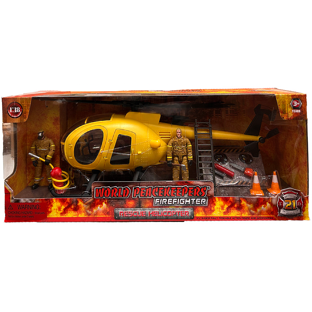 This high-quality firefighting playset includes a 13" Helicopter, two high-articulation firefighter figurines, and a variety of play accessories. Comes in a window box for great retail display.